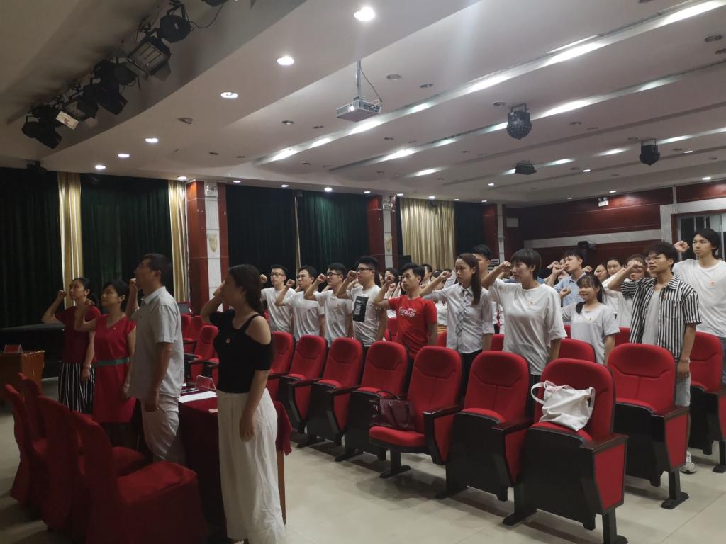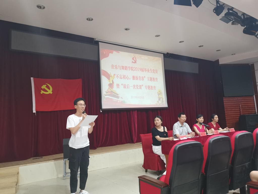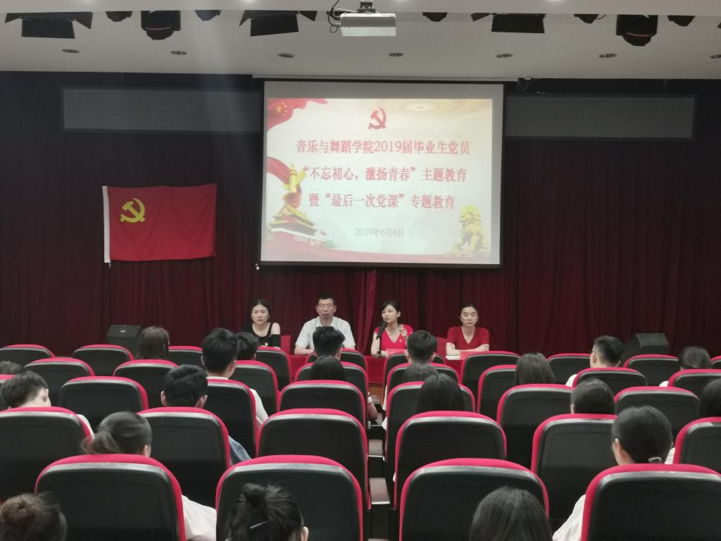 党课现场播放了近两年党员各项活动照片组成的视频,从党旗在心中飘扬、在校园飘扬、在社区飘扬三个方面展现党员风采;音乐学支部毕业生党员何郑青带领全体人员向党旗庄严宣誓,重温入党誓词;音乐学支部毕业生党员纪官升、音乐表演与舞蹈表演支部毕业生党员刘沛发言,他们表示将不忘初心,在新的岗位上继续发挥党员的先锋模范作用。