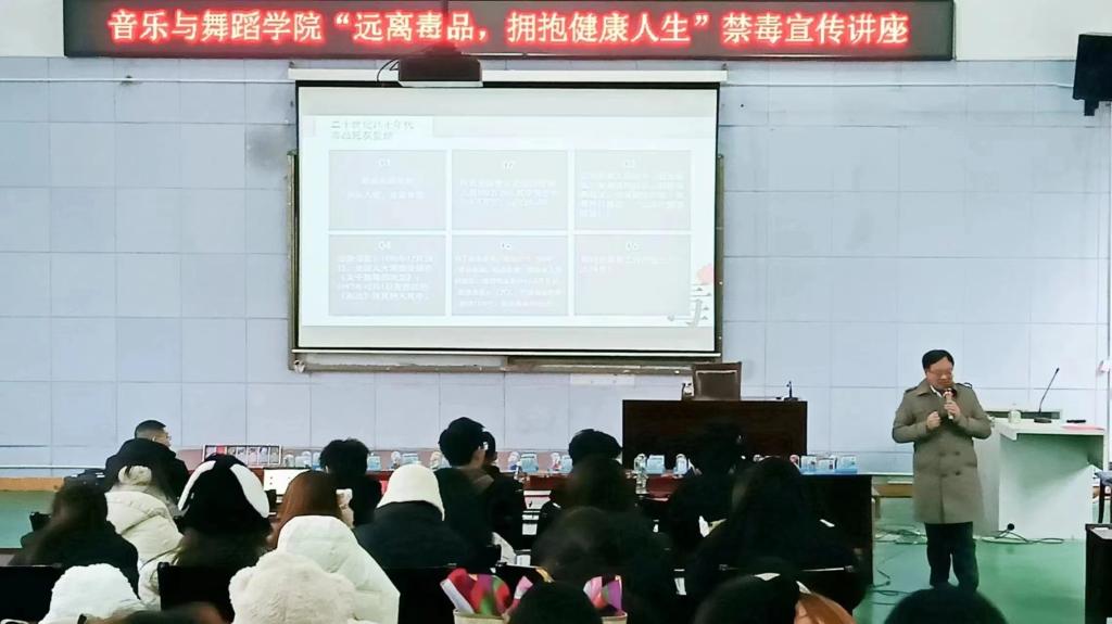 (通讯员 张博谦)11月30日下午14:30,音乐与舞蹈院在S3开展了“远离毒品,拥抱健康人生”禁毒宣传讲座。襄阳市强制隔离戒毒所副所长宋俊峰、民警郭建增、襄阳市图书馆“市民大讲堂”负责人邓辉、湖北巨天律师事务所律师朱自军、腾博tengbo9885官网党委副书记胡磊、辅导员及各班学生代表参加了活动。